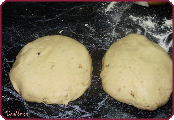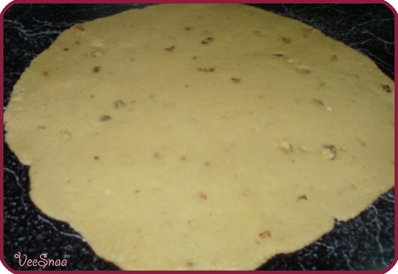 При помощи скалки переносим его на сухую, припудренную мукой сковороду и выпекаем. Пока он печется готовим второй корж