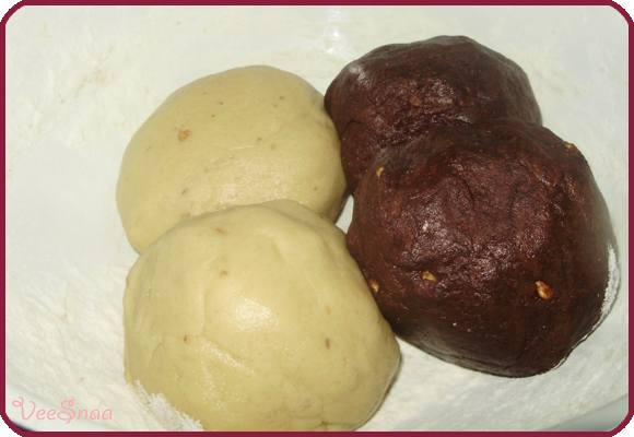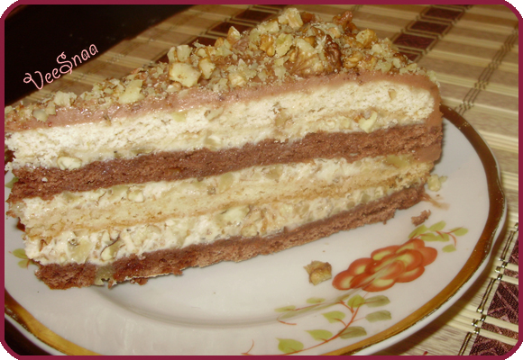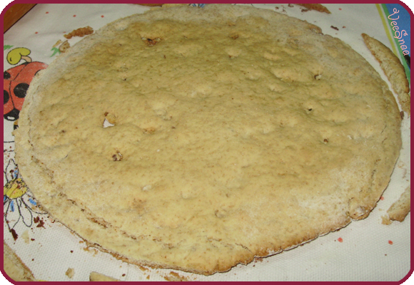 18. Так проделываем со всеми коржами. Пока печется один корж, обрабатываем другой. Чередуя шоколадный корж с обычным.