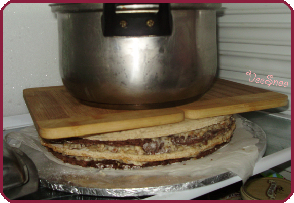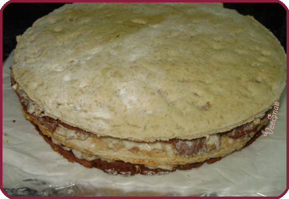 19. После того, как все коржи испечены и прослоены кремом ставим сверху тяжелый пресс и забываем о нашем торте на 10-15 часов. я обычно выпекаю торт вечером и забываю о нем до следующего дня, а то и вечера