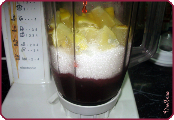 Положить в блендер лимон, сахар и клюкву. В моем случае клюквы не нашлось, я заменила ее смородиновым конфетюром. Положила его примерно 150-200 гр.