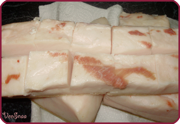 5. Пока мы все готовили сало отдохнула. Надрезаем мякоть сала не доходя до шкурки на квадратики