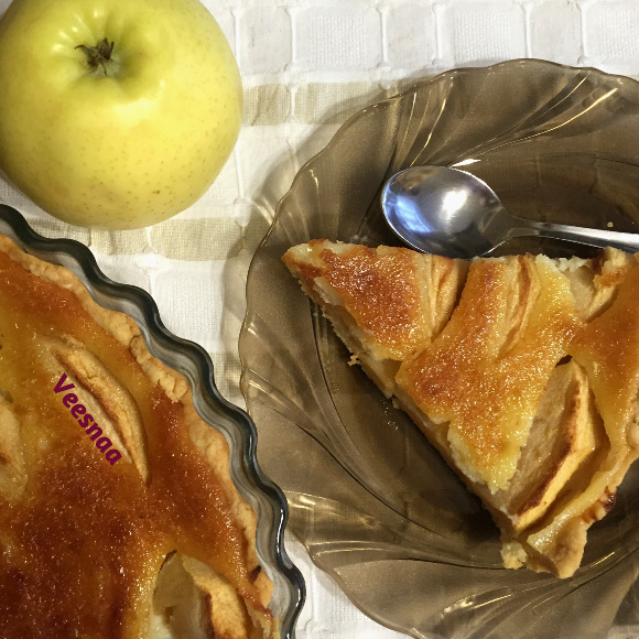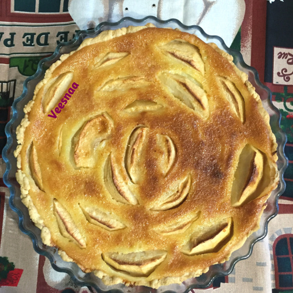 13. На горячий корж с яблоками вылить карамельно-яичную заливку, уменьшить температуру до 150 градусов и выпекать 40 минут.