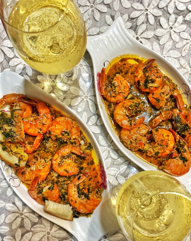 Подаем креветки с белым вином и кусочком черного хлеба.