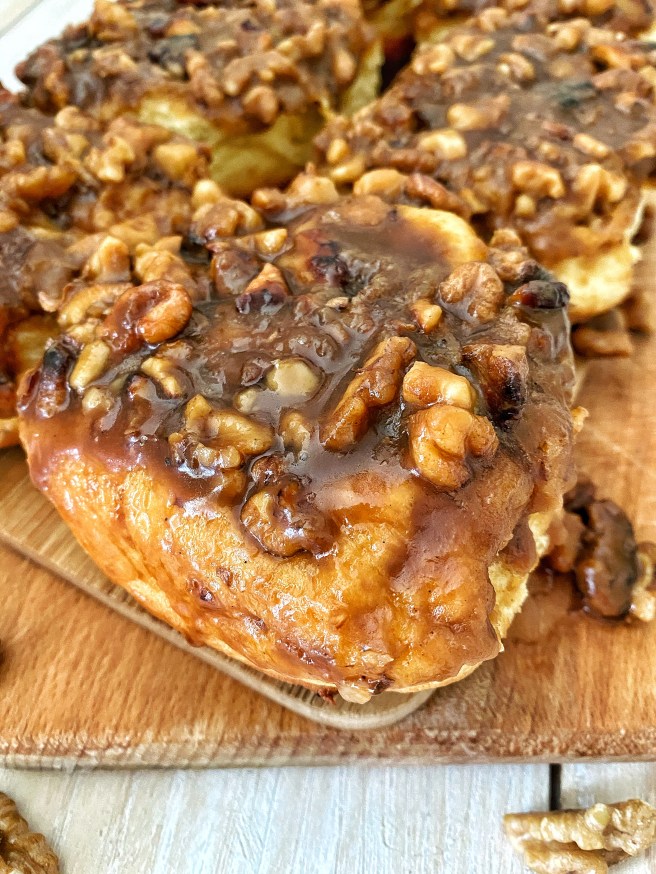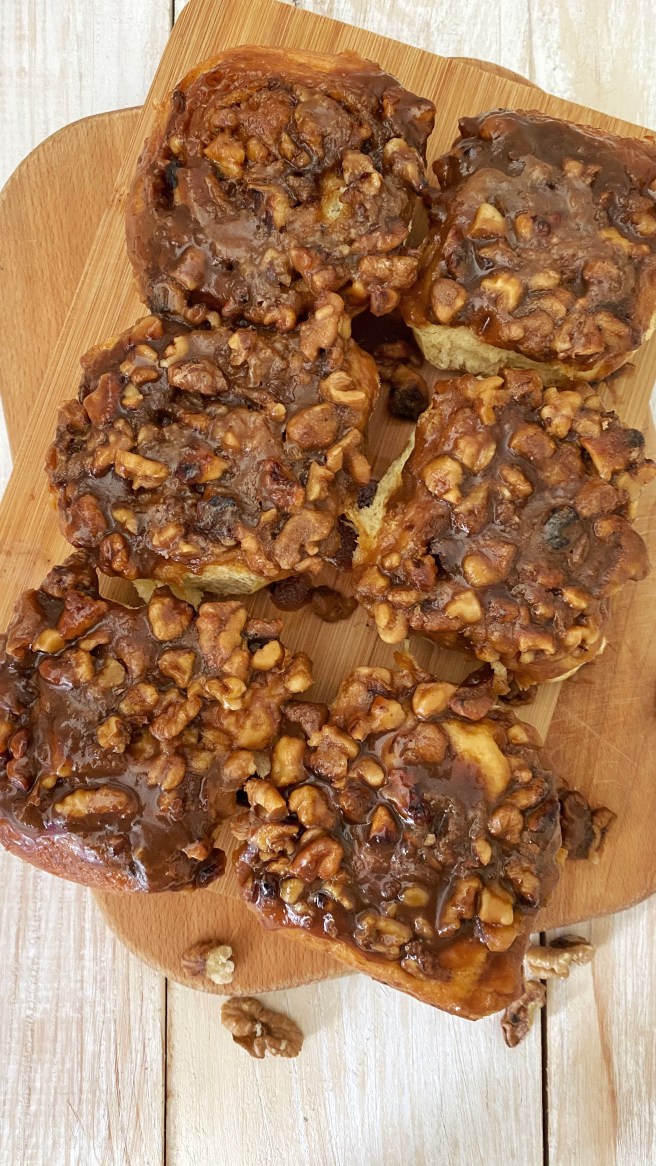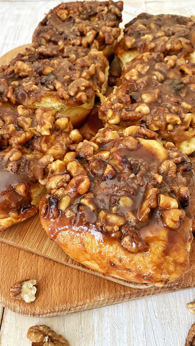 С тех пор прошло несколько лет, я перепробовала много разного печенья и булочек и вот недавно в ленте Инстаграм снова мелькнули эти булочки, заметьте, я уже не говорю печенье, в этот раз я уже признала в них булочки. Потом в youtube и меня осенило. Это не печенье и это не розочки. Здесь совершенно другое тесто, оно сдобное, а в моих розочках, хоть тесто и дрожжевое, но сухое, действительно напоминает печенье. В этих булочках есть карамель, а в «розочках» нет. Да и количество орехов. В розочках орех подчеркивают вкус, а в этих булочках вкус строиться на количестве орехов. К тому же в классическом рецепте используется пекан. Хотя я обошлась простыми грецкими, а точнее теми, которые были дома в изобилии. Если бы у меня был бы миндаль, или фундук, я бы использовала их. Но, у меня были все ингредиенты, кроме пекана, а ждать похода в магазин, который и так в условиях ЧП и самоизоляции происходит по расписанию желания не было. Пришлось готовить из того что было, пока запал не пропал и орехи не съелись. Получилось не просто вкусно, а бомбически вкусно. Честно, я редко когда говорю что за какое-то блюдо можно отдать пол царства. Хотя готовлю и пробую много разных вкусняшек. Но, за эти липкие булочки действительно не жалко пожертвовать фигурой. Потолстеть и ни разу об этом не пожалеть!!!