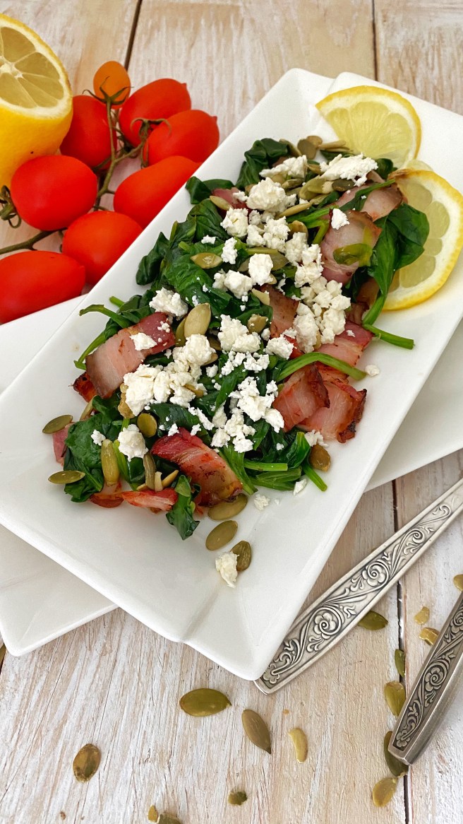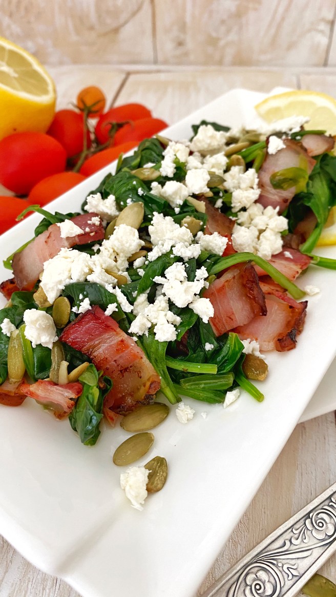 7. Кладем на тарелку шпинат с беконом, сверху крошим болгарскую брынзу, посыпаем тыквенными смесками и сбрызгиваем лимонным соком.