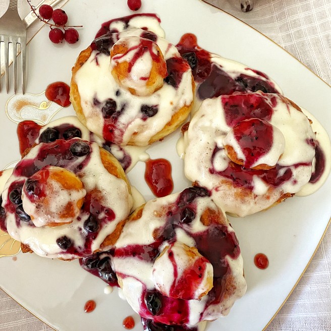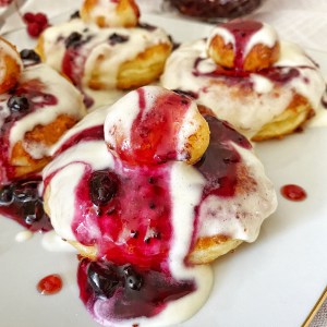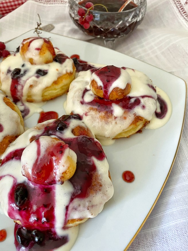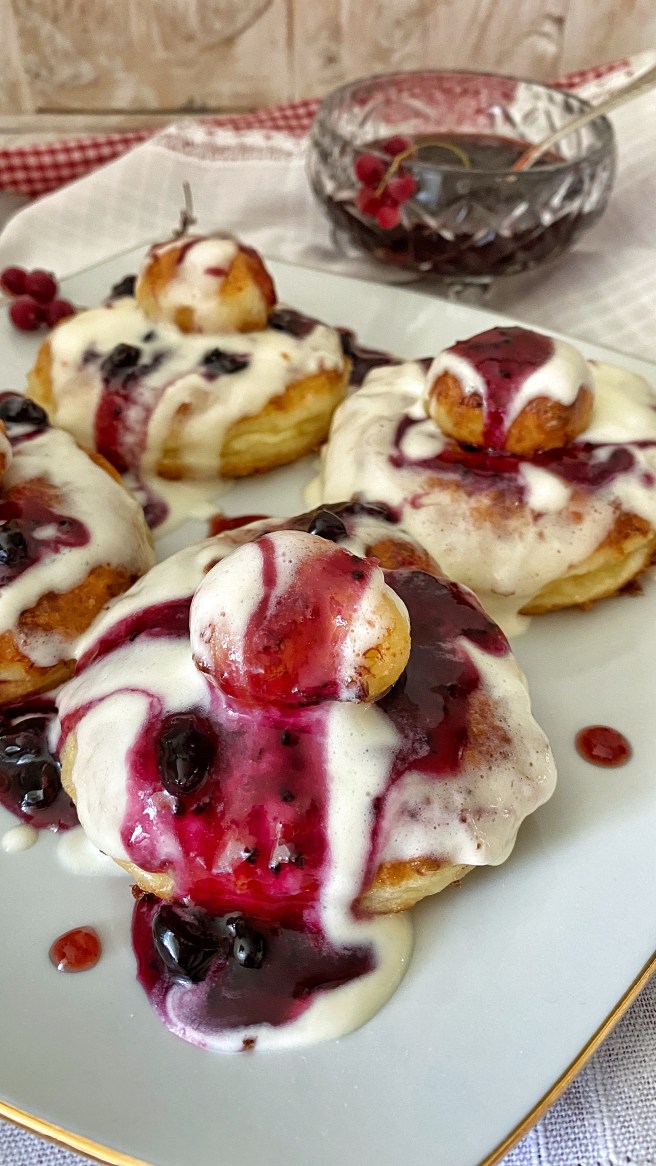 На тарелку кладут большой папанаш, в отверстие заливают сметану с сахарной пудрой и кладут смородиновое варенье. Сверху на отверстие кладут маленький шарик папанаша и его так же поливают сметаной и вареньем.
