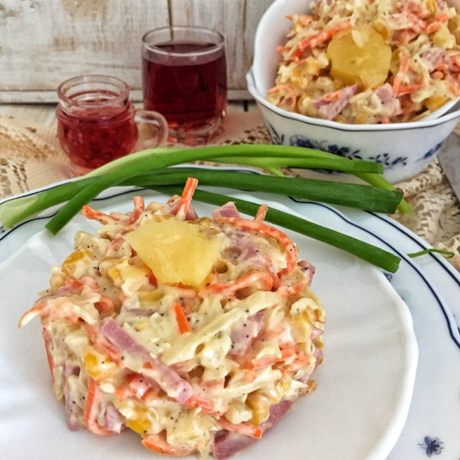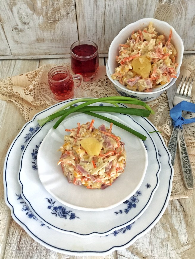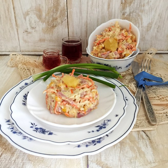 Салаты с ананасами пользуются особой популярностью, поэтому мне кажется, что их много не бывает. Конечно, сегодняшний салат сложно назвать праздничным, но весьма оригинальным можно.