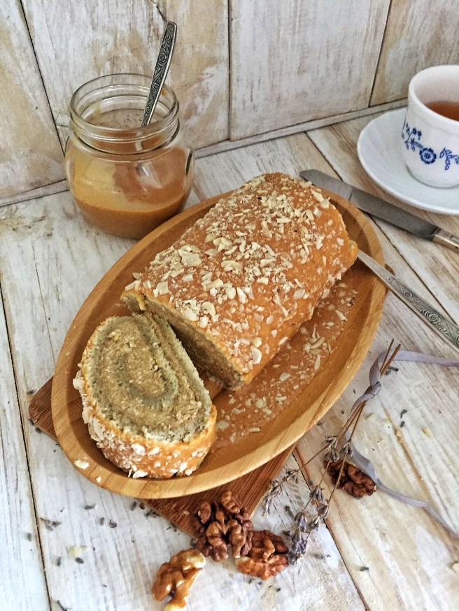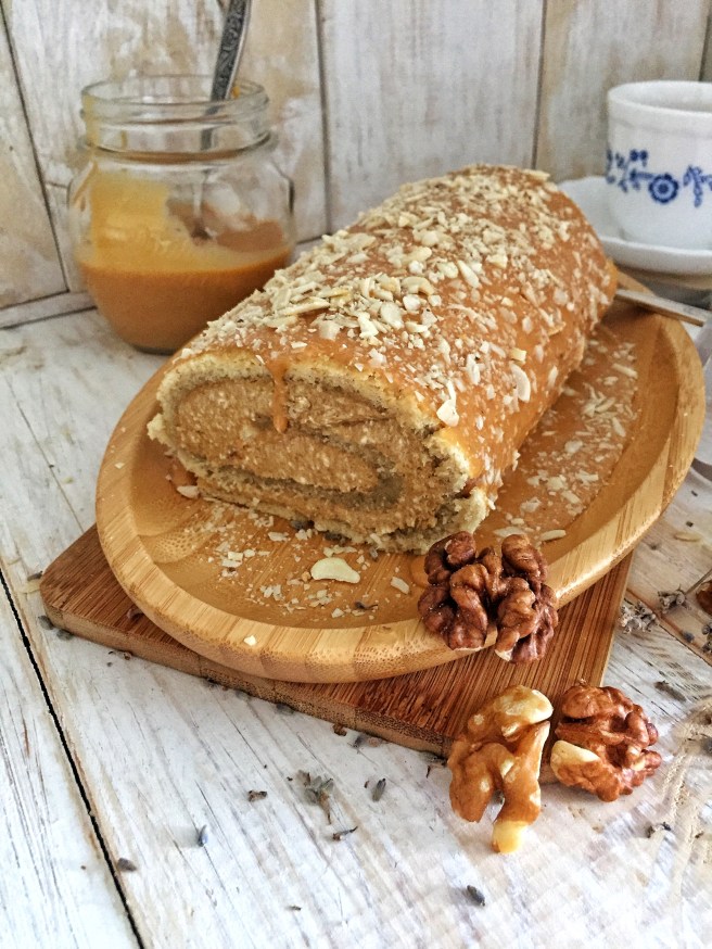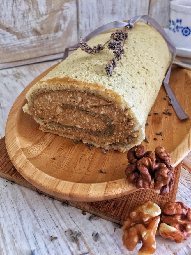 9. Очень быстро пропитываем корж лавандовым сиропом и аккуратно, вместе с бумагой, сворачиваем в рулет.
