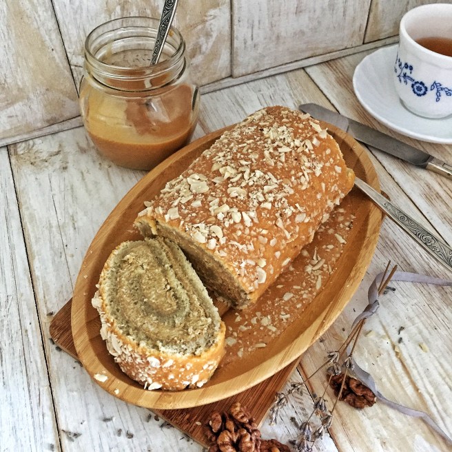 10. Когда рулет остынет, разворачиваем корж, убираем бумагу, равномерно промазываем ее кремом из халвы. Снова сворачиваем крем.