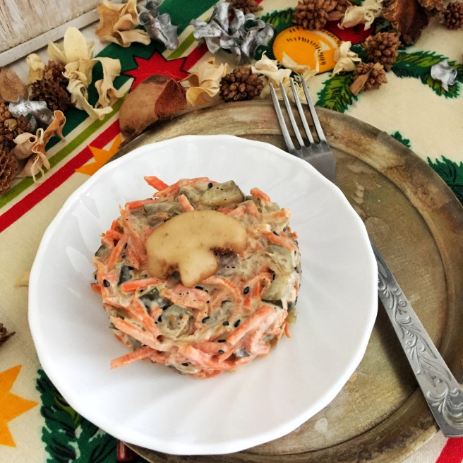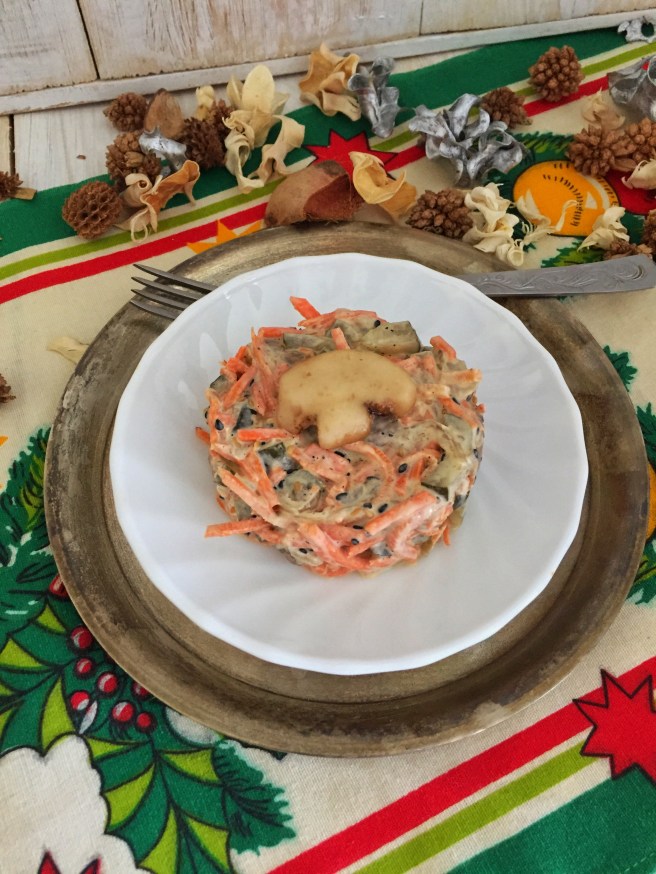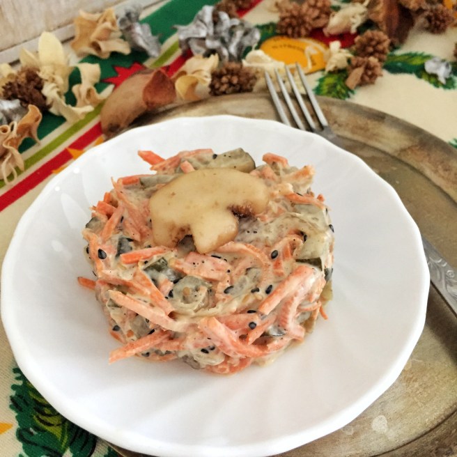 6. Соединяем в миске грибы с луком, морковь, огурцы, заправляем майонезом (или натуральным йогуртом), солим и перчим по-вкусу. Перемешиваем.