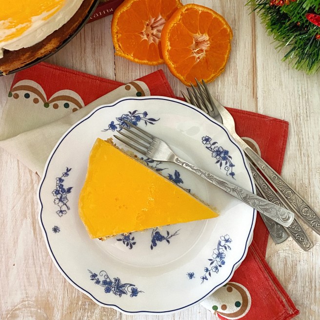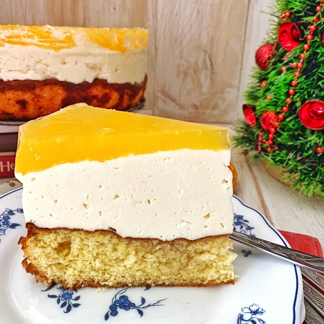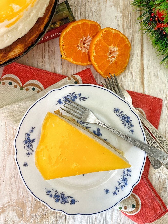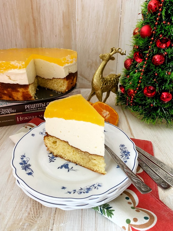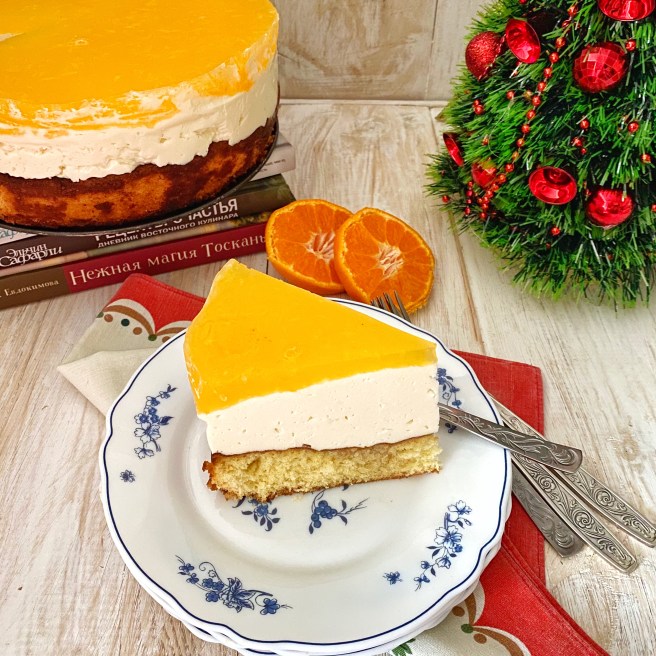 26. Вынимаем из холодильника застывший полу готовый торт и сверху на него аккуратно выливаем апельсиновую массу.