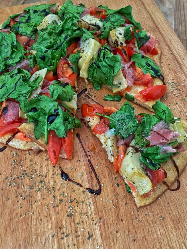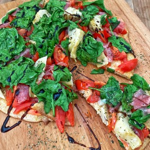 7. Возвращаем нашу пиццу в духовку еще на 5 минут, пока зелень слегка не подвянет. Достаем, сбрызгиваем оливковым маслом и по желанию бальзамическим уксусом. Подаем.