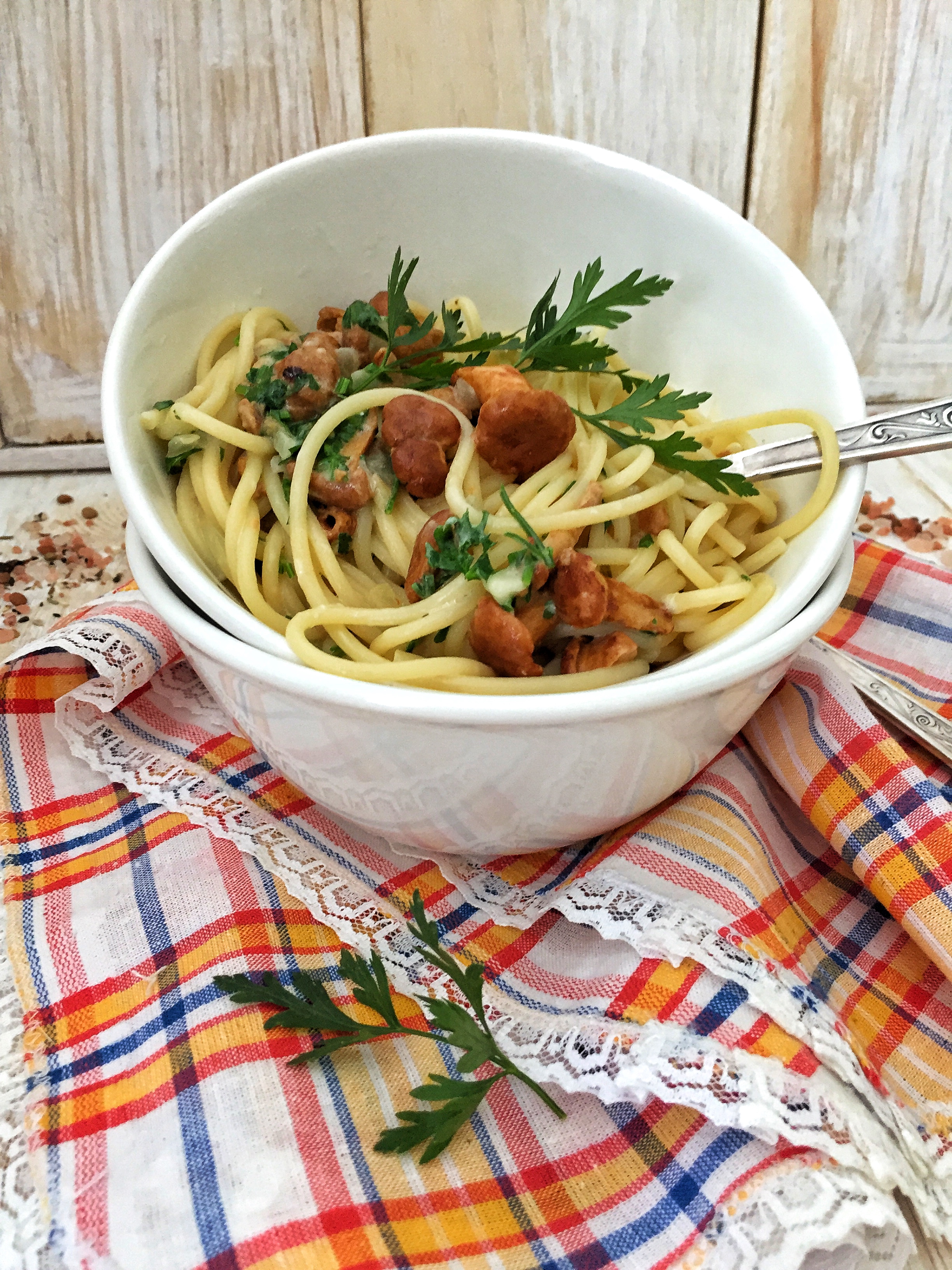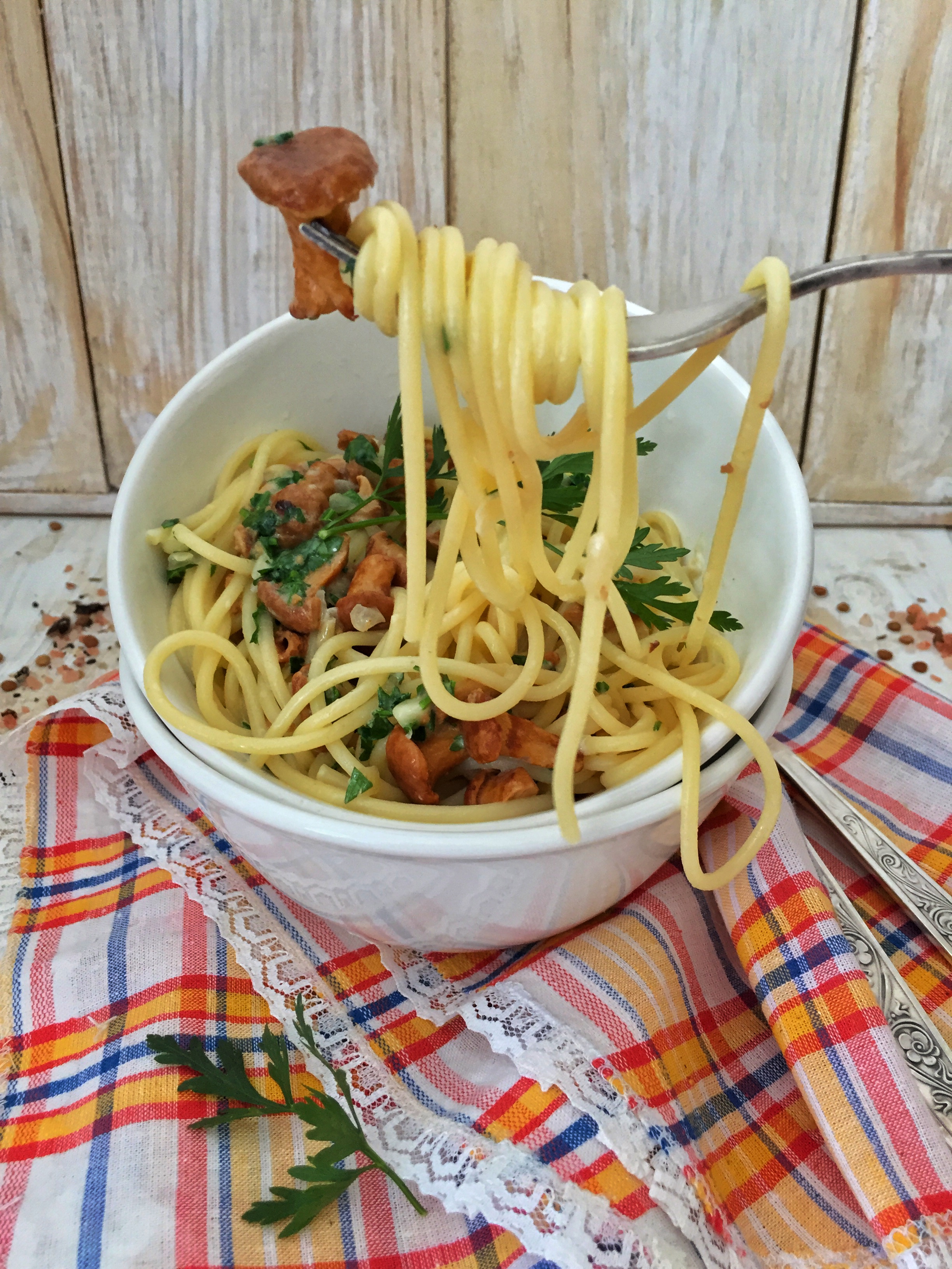 9. Выкладываем наши спагетти с лисичками в глубокую тарелку или блюдо и посыпаем пармезаном. Перемешиваем. Сверху, для украшения и ноток свежести посыпаем петрушку. Подаем.