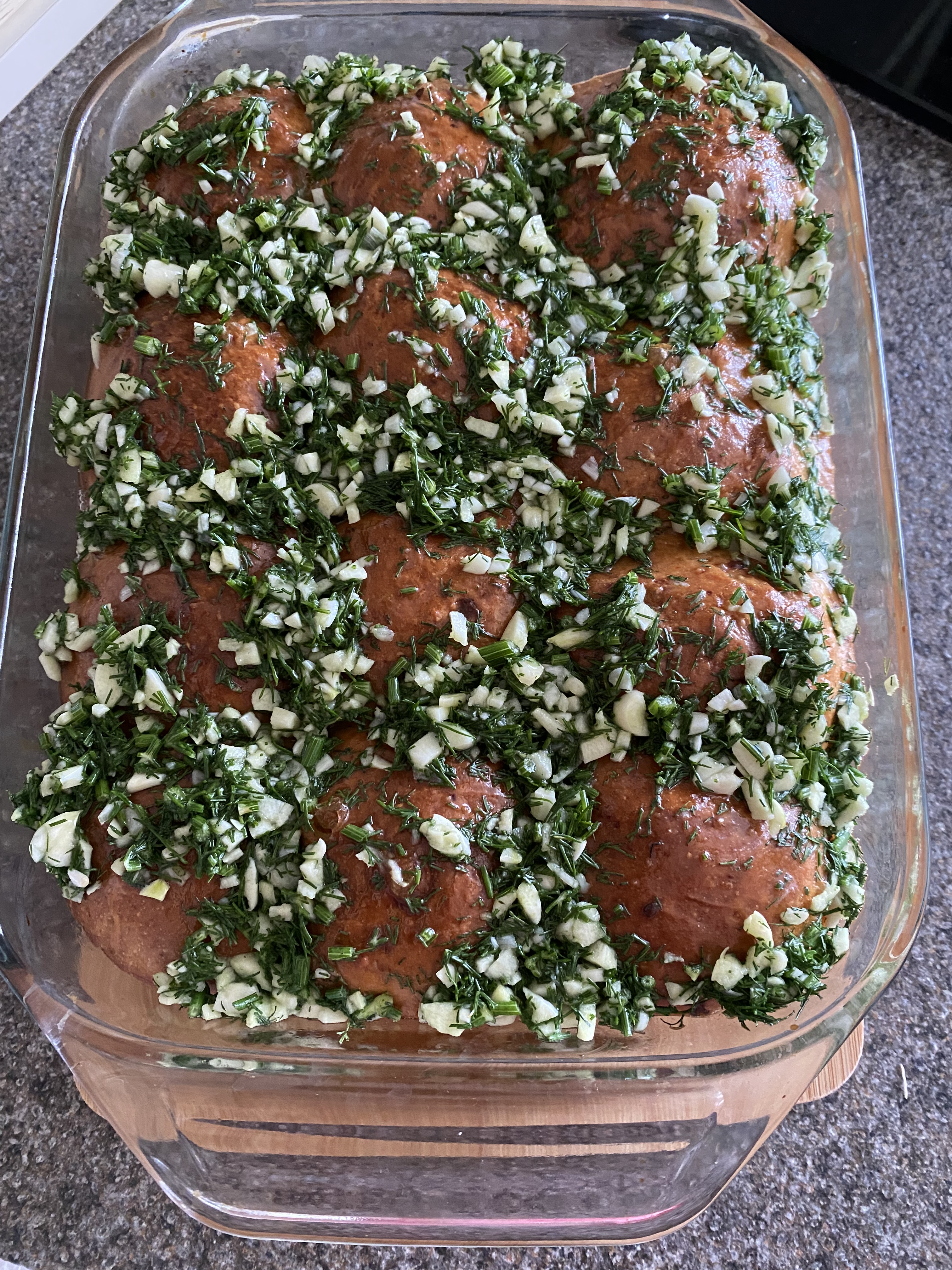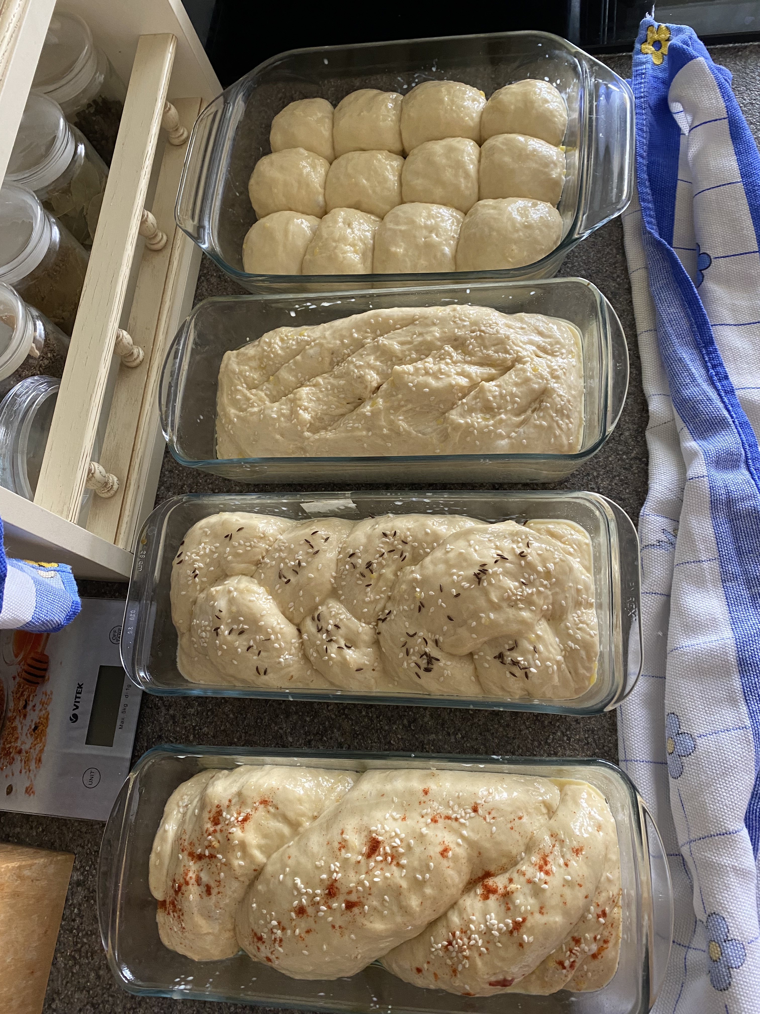P.S. из пяти буханок я одну сделала с помидорами, одну с соусом песто, одну оставила просто буханкой, а из оставшихся двух частей сформировала шарики, который в конце приготовления смазала смесью чеснока, укропа и оливкового масла.