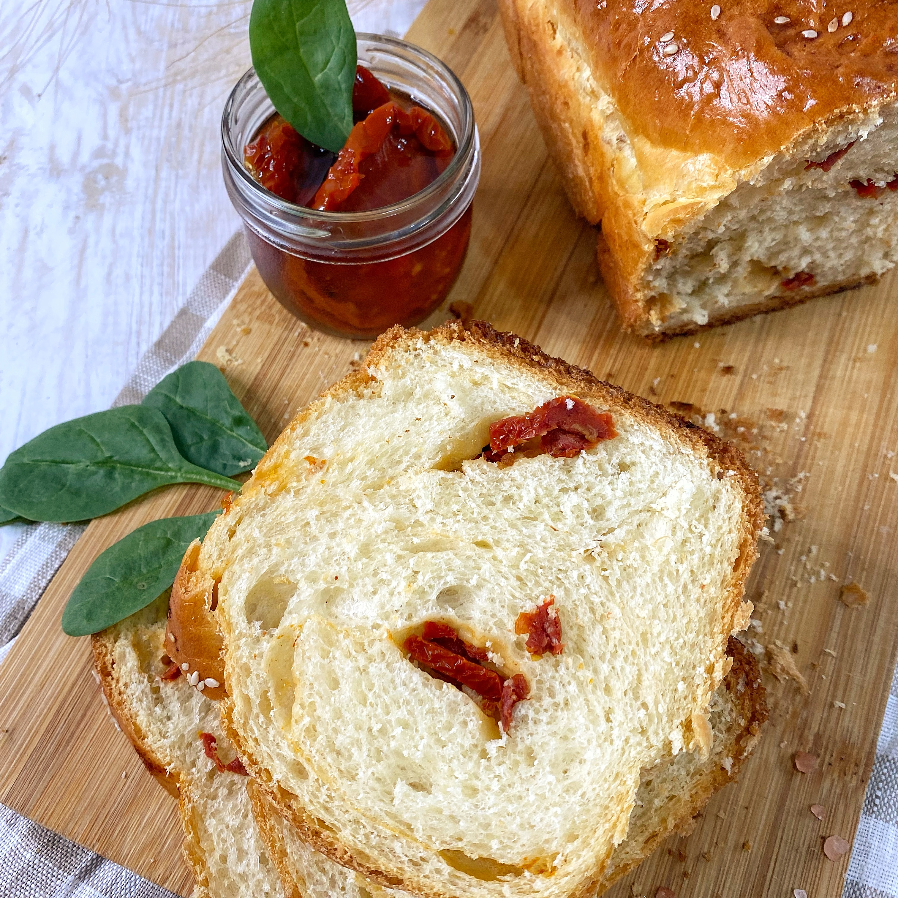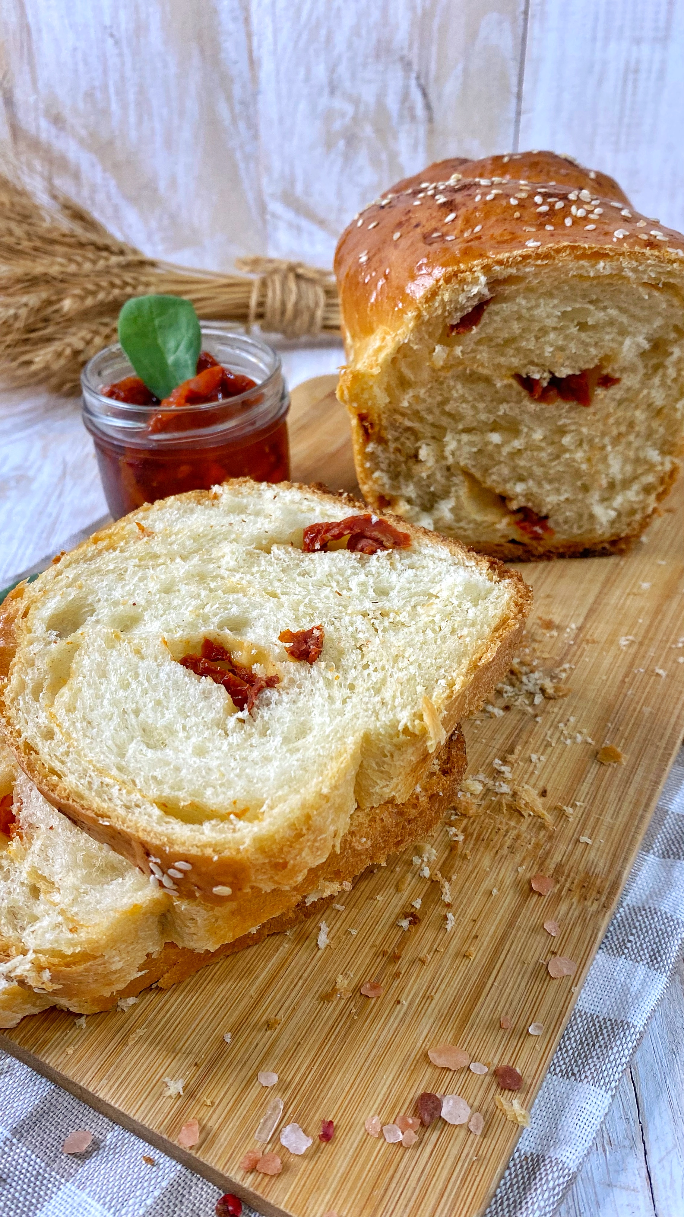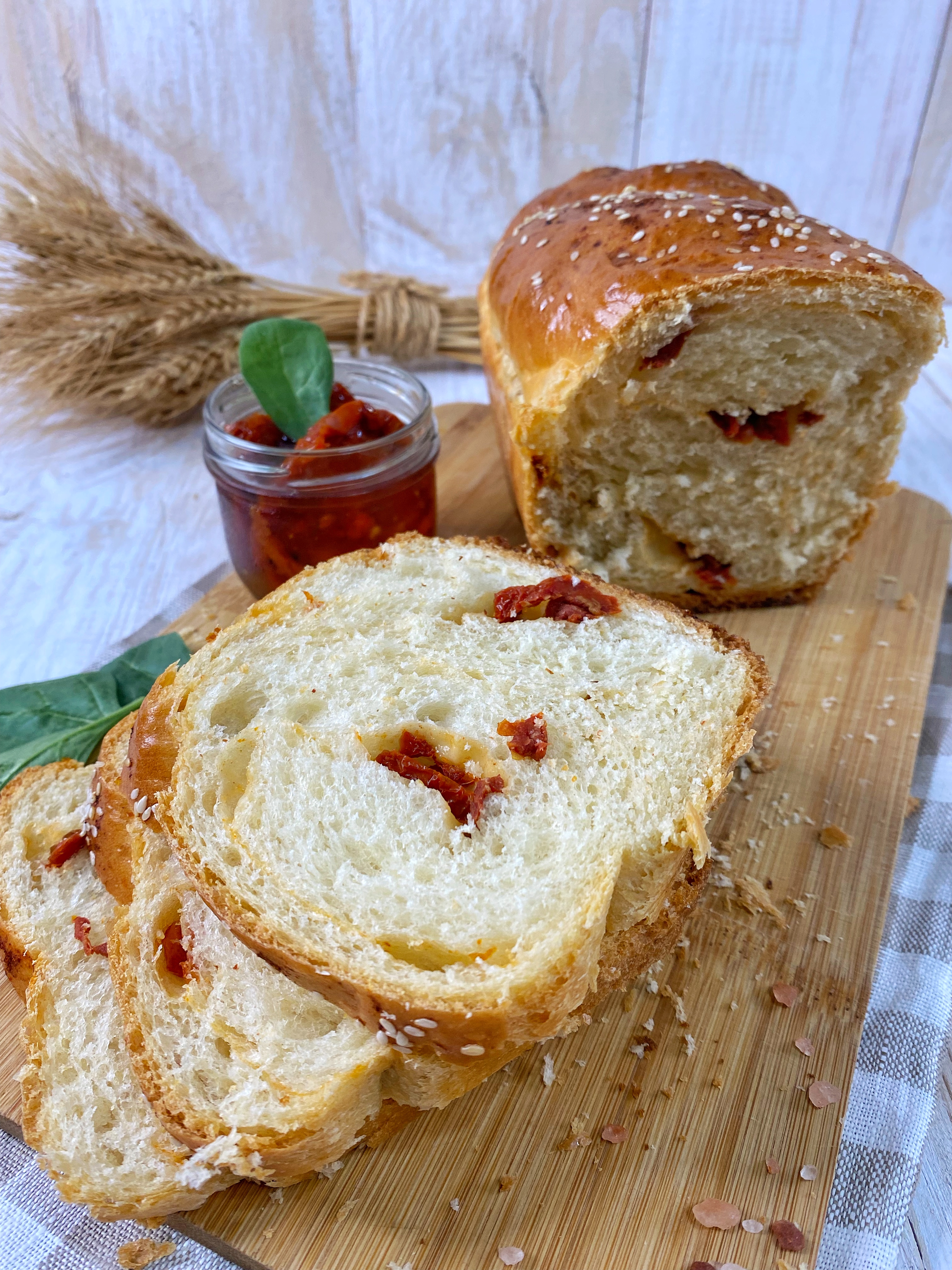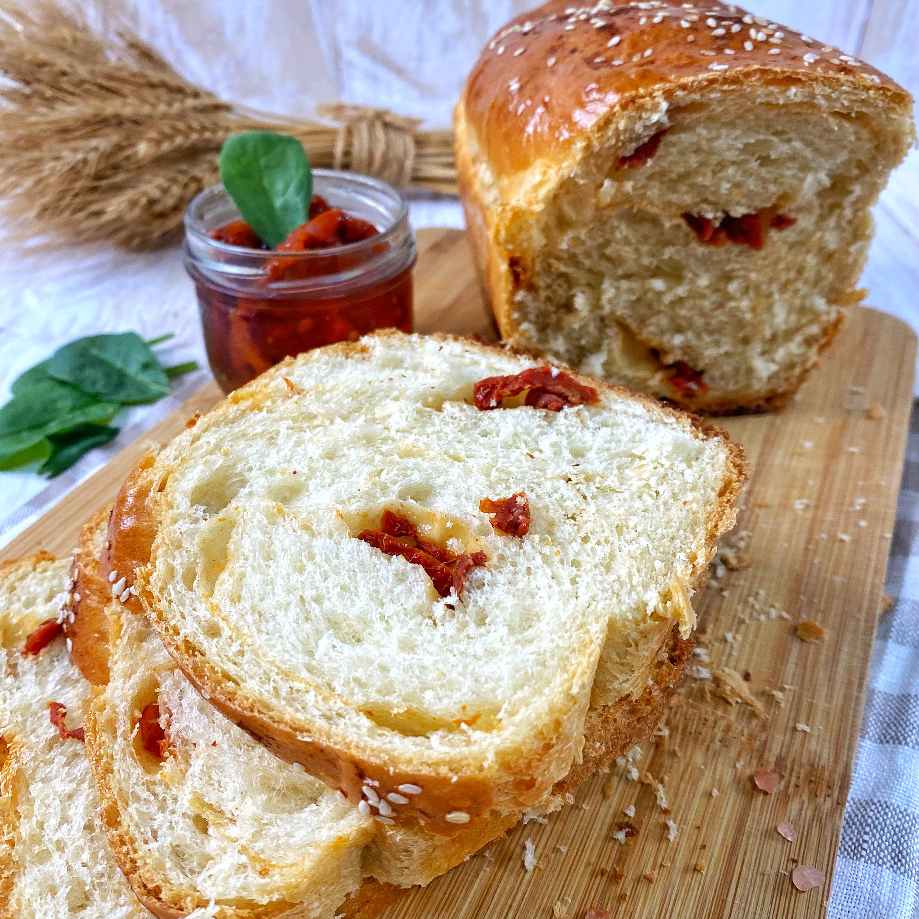 - Выкладываем на прямоугольники измельченный вяленные помидоры и сворачиваем прямоугольник в рулет. Из трех получившихся рулетов плетем косичку, которую перекладываем в подготовленную форму для выпечки. Накрываем форму полотенцем и оставляем еще на час подходить.