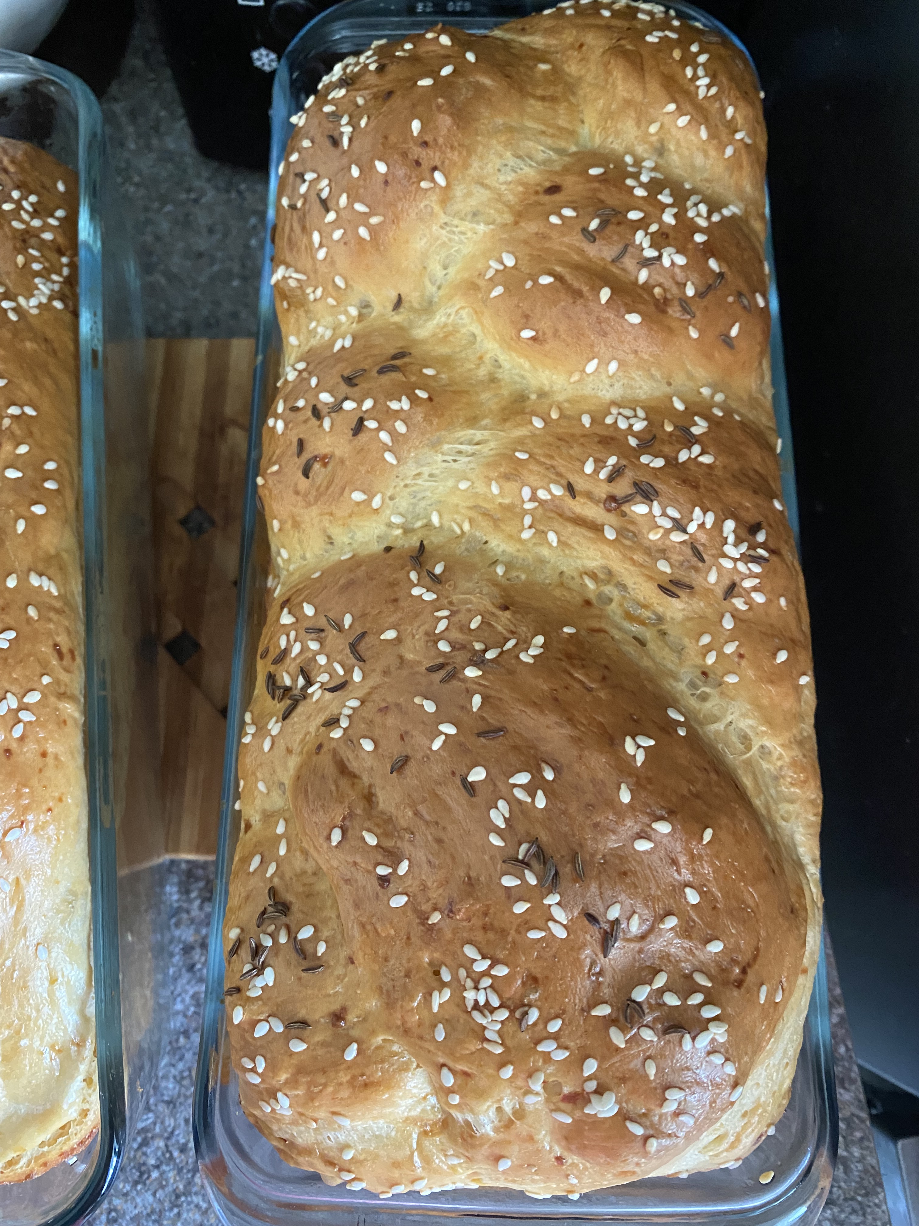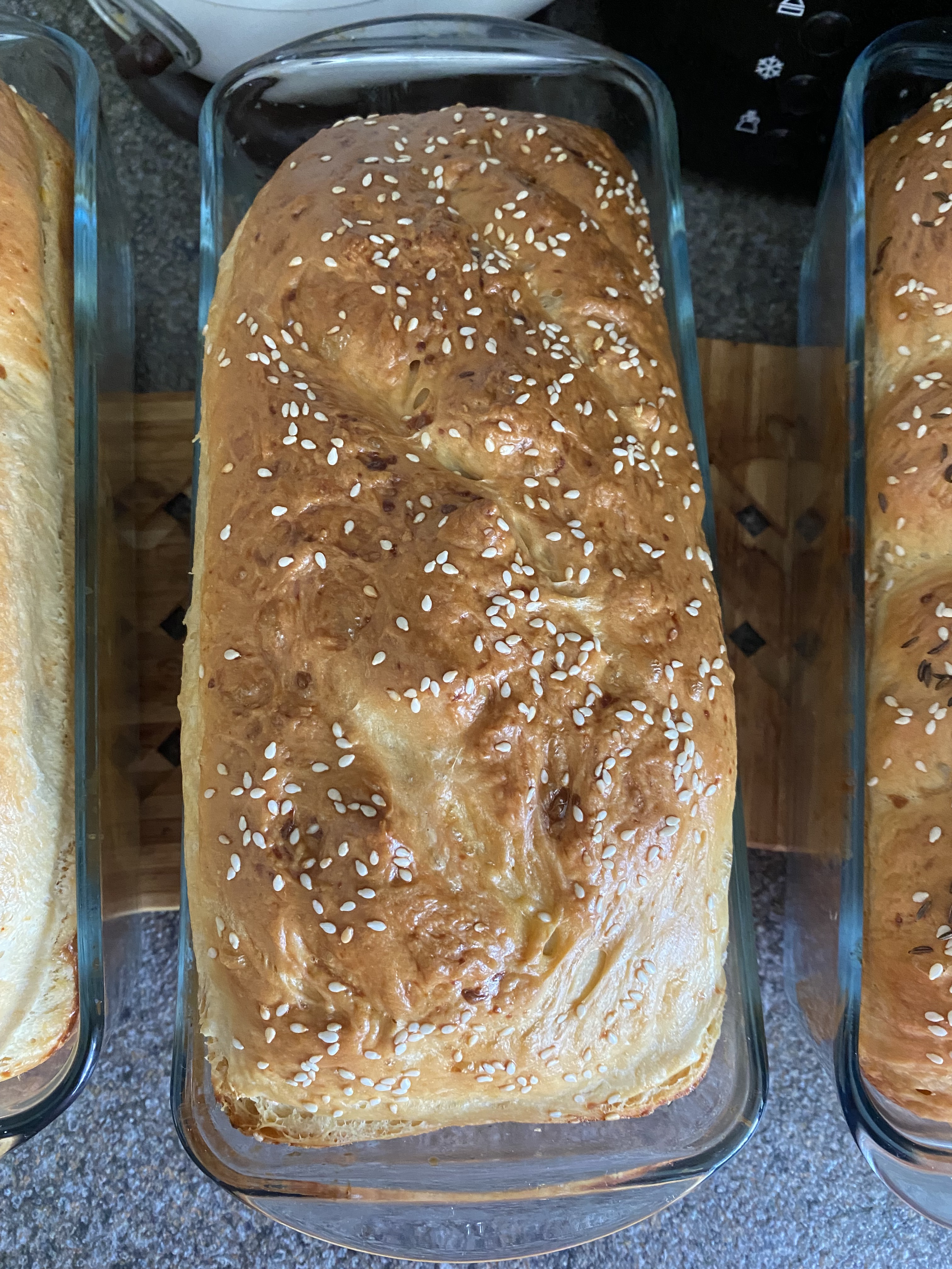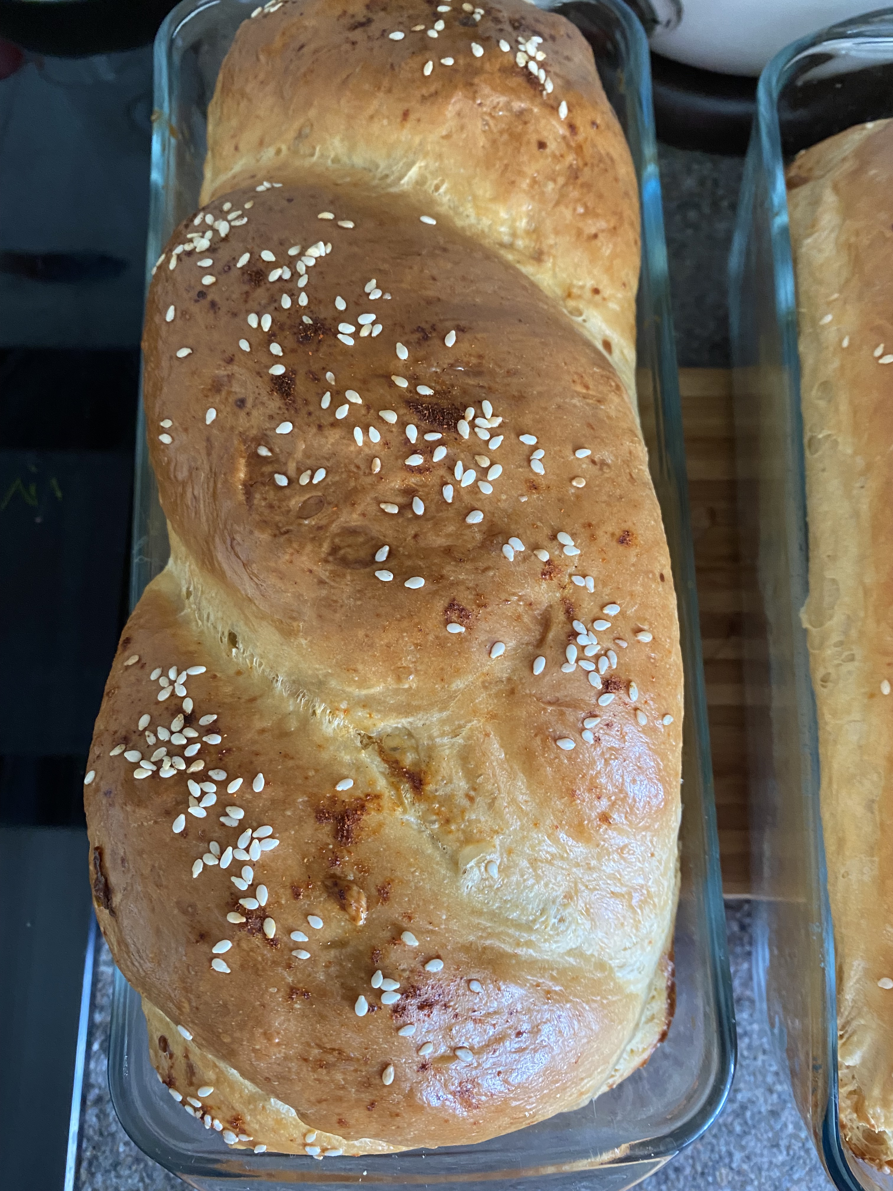 - Через час, когда хлеб вырастит в объеме смазываем его смазкой из молока и яиц, посыпаем кунжутом и отправляем разогретую до 180С духовку на 45-65 минут (зависит от духовки) хлеб должен получится румяный, но в тоже время пропеченный внутри, проверяйте на сухую спичку.