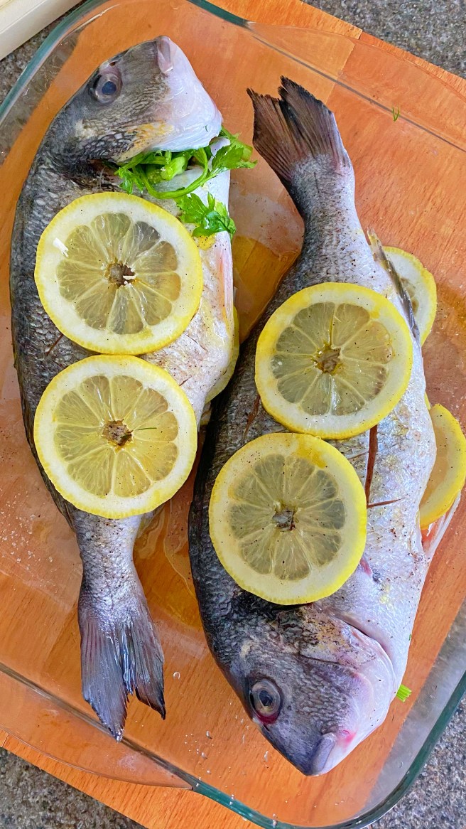 Иногда, я оставляю рыбу с головой, вынимаю только жабры и внутренности. Так же кладу в нее зелень, лимон и делаю крестовые надрезы. Заменив укроп на петрушку и «поигравшись» с количеством лимона получаю совершенно другой вкус и как будто новое блюдо.