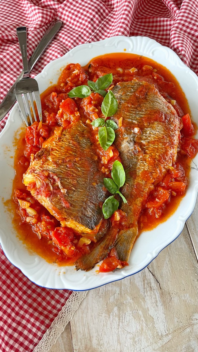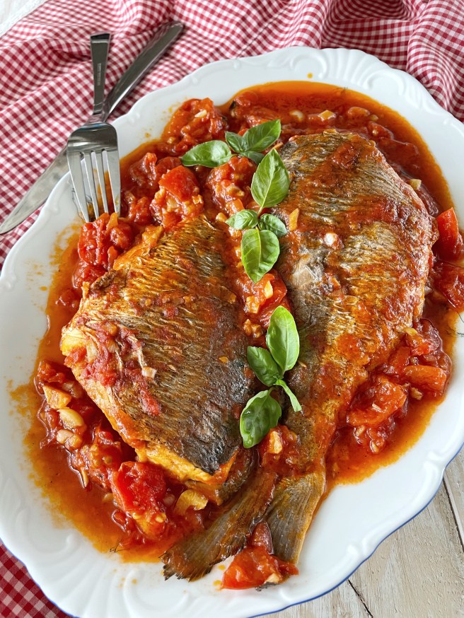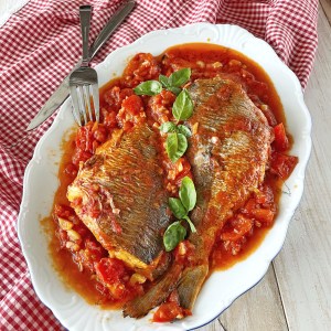 Этот рецепт достался мне в разговоре на совершенно не кулинарные темы от моей кумы – женщины с идеальным вкусом и манерами. Я доверяю ее вкусу, и пока она мне рассказывала все подробности приготовления я в красах представила себе вкус и запах этого блюда, мне уже его хотелось. Она сказала что привезла его из Рима. А я вспомнила римскую кухню, и что они, в принципе, могут из минимума ингредиентов сделать неповторимый шедевр. Не знаю почему, я вспомнила их «баклажаны пармеджано» и мне показалось, что это не меньший шедевр и не ошиблась. После того, как мы сняли пробу я все время думала, что это же так просто, почему я сама не додумалась так приготовить рыбу? Просто и вкусно и больше нет слов… один калейдоскоп эмоций!