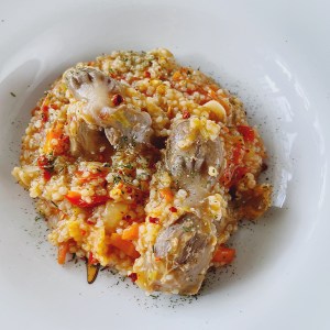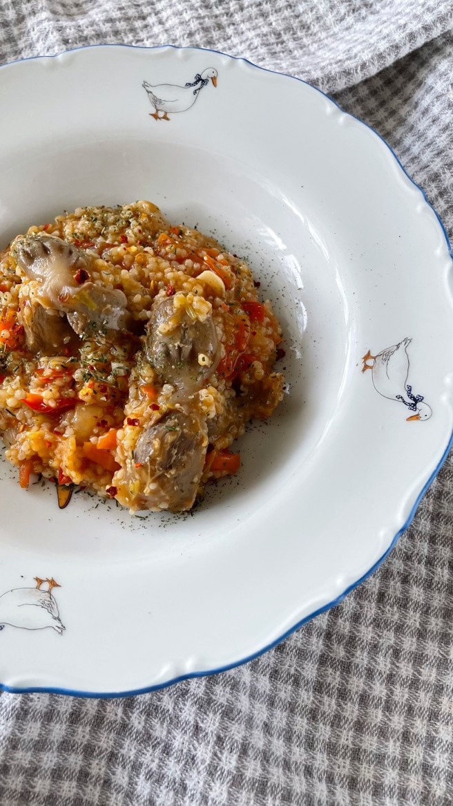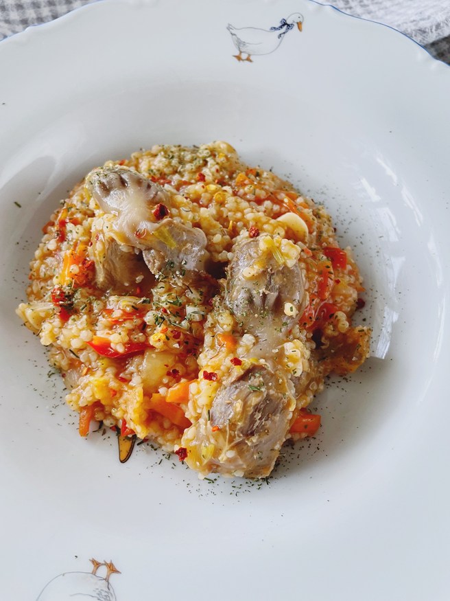 6. Крупу сорго промываем и так же отправляем в сотейник. Заливаем водой. Я использую бульон, в котором варились пупочки. Тщательно перемешиваем, потому что сорго любит сбиваться в комочки.