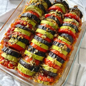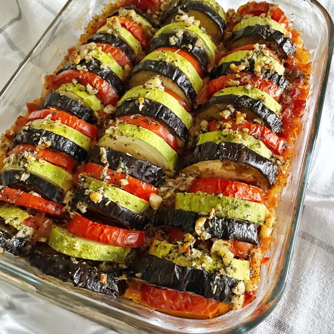 7. Накрываем овощи фольгой и отправляем в заранее разогретую до 200 С духовку на час. Через час снимаем фольгу и запекаем овощи еще минут 20-30.