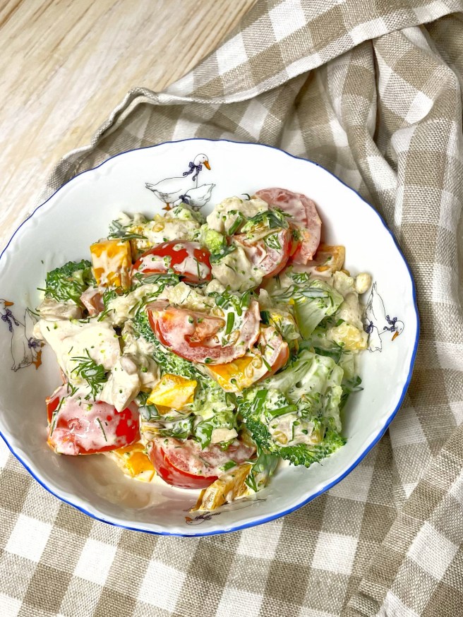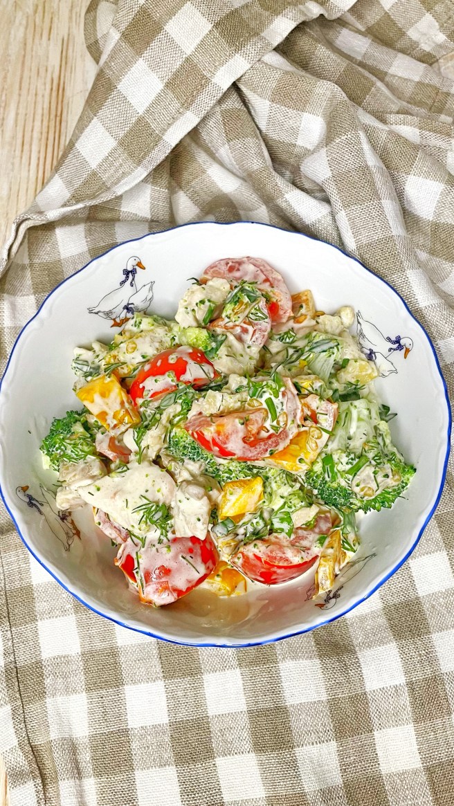 6. Отдельно перемешать майонез и сметану, добавить к овощам с мясом, перемешать. При необходимости посолить.