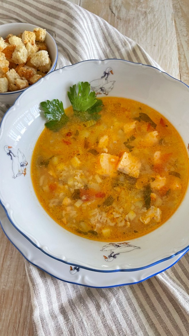 Готовлю это суп практически всегда, когда солю красную рыбу. Отрезаю у рыбы хвост, из него варю этот суп, а уже остальную тушку солю. Мы очень любим его. Готовится он быстро, получается очень вкусным. Иногда, когда времени совсем не хватает, я вообще изменить последовательность. Вначале обжарить овощи, затем залить воду, бросить в нее рис, потом картофель, в конце рыбу и специи и готово.Настоящий суп для мамочек, у которых никогда нет свободного времени. В какой бы последовательности не заложить ингредиенты, суп всегда получится великолепно.
