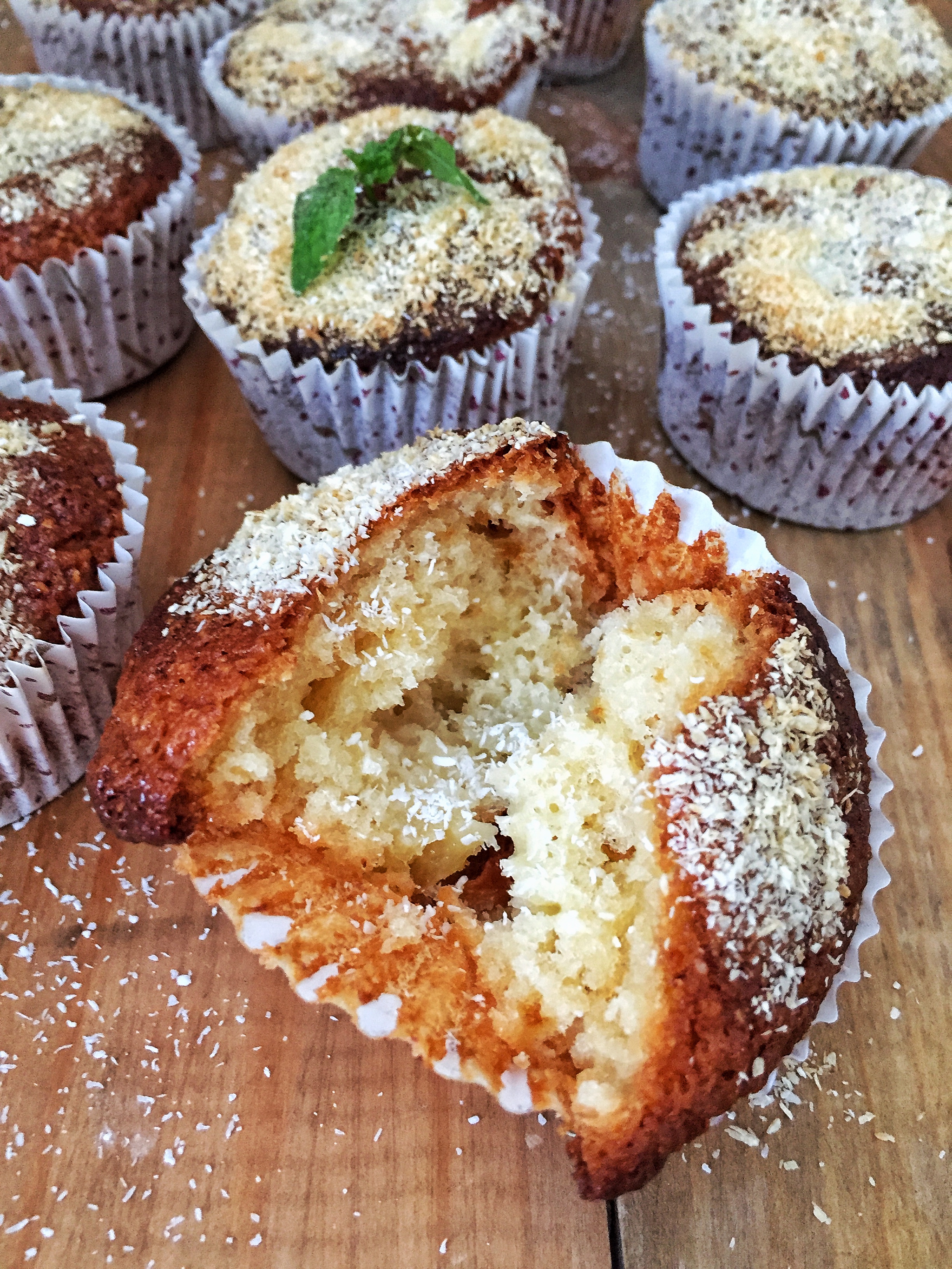 5. Выкладываем тесто в формочки (у меня силиконовые), посыпаем сверху кокосовой стружкой и отправляем в разогретую духовку выпекать 30–35 минут при температуре 180 градусов.