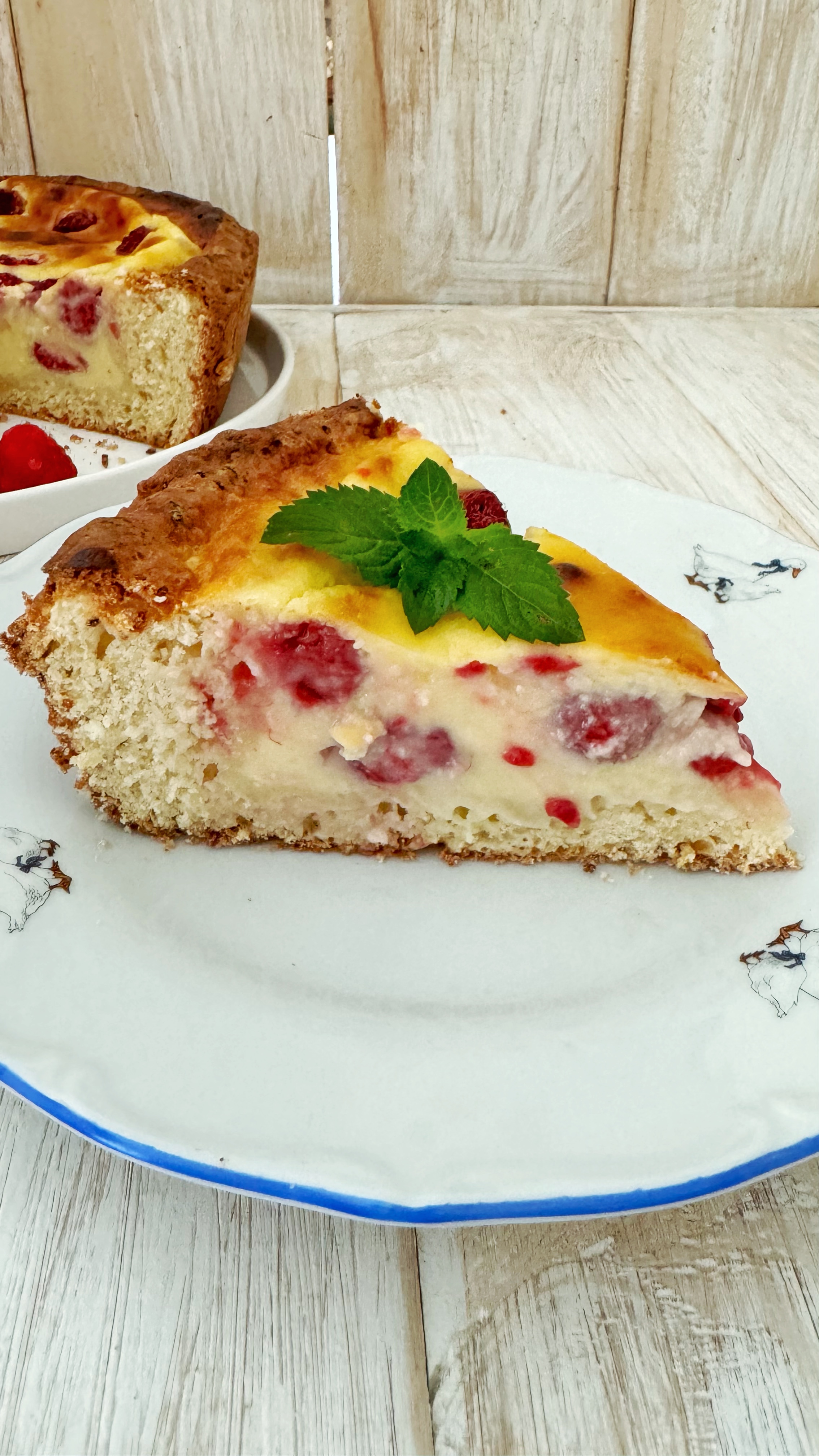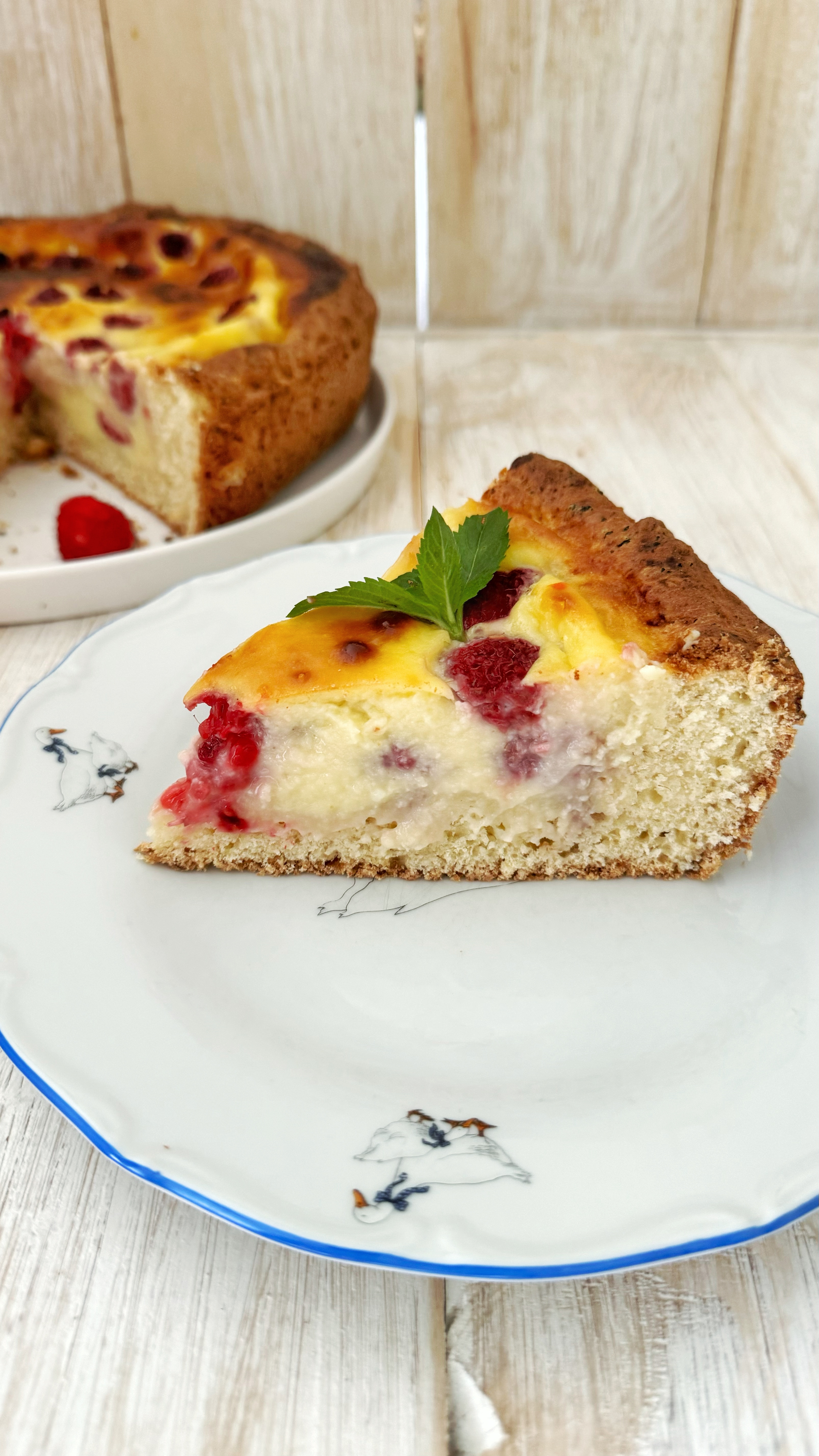 7. Добавляем в крем часть малины и аккуратно перемешиваем. Выливаем крем в заготовку для пирога, сверху распределяем оставшуюся малину и отправляем пирог в разогретую до 180 С духовку. На 45-60 минут до золотистого цвета, середина пирога должна подрагивать — это нормально.