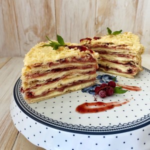 Этот торт покоряет своей хрустящей текстурой коржей и нежным кремом на сгущёнке. Сочетание сливочного вкуса с кисленьким смородиновым вареньем делает десерт идеально сбалансированным — не приторным, а освежающим. Благодаря необычной технологии рубленого теста, коржи получаются воздушными и слоистыми, с пузырьками и хрустом. Такой торт отлично подойдёт для уютного семейного чаепития или праздничного стола. Аромат выпечки и сладко-кислая начинка не оставят равнодушными ни детей, ни взрослых. Готовится он несложно, но требует аккуратности и терпения — результат стоит того!
