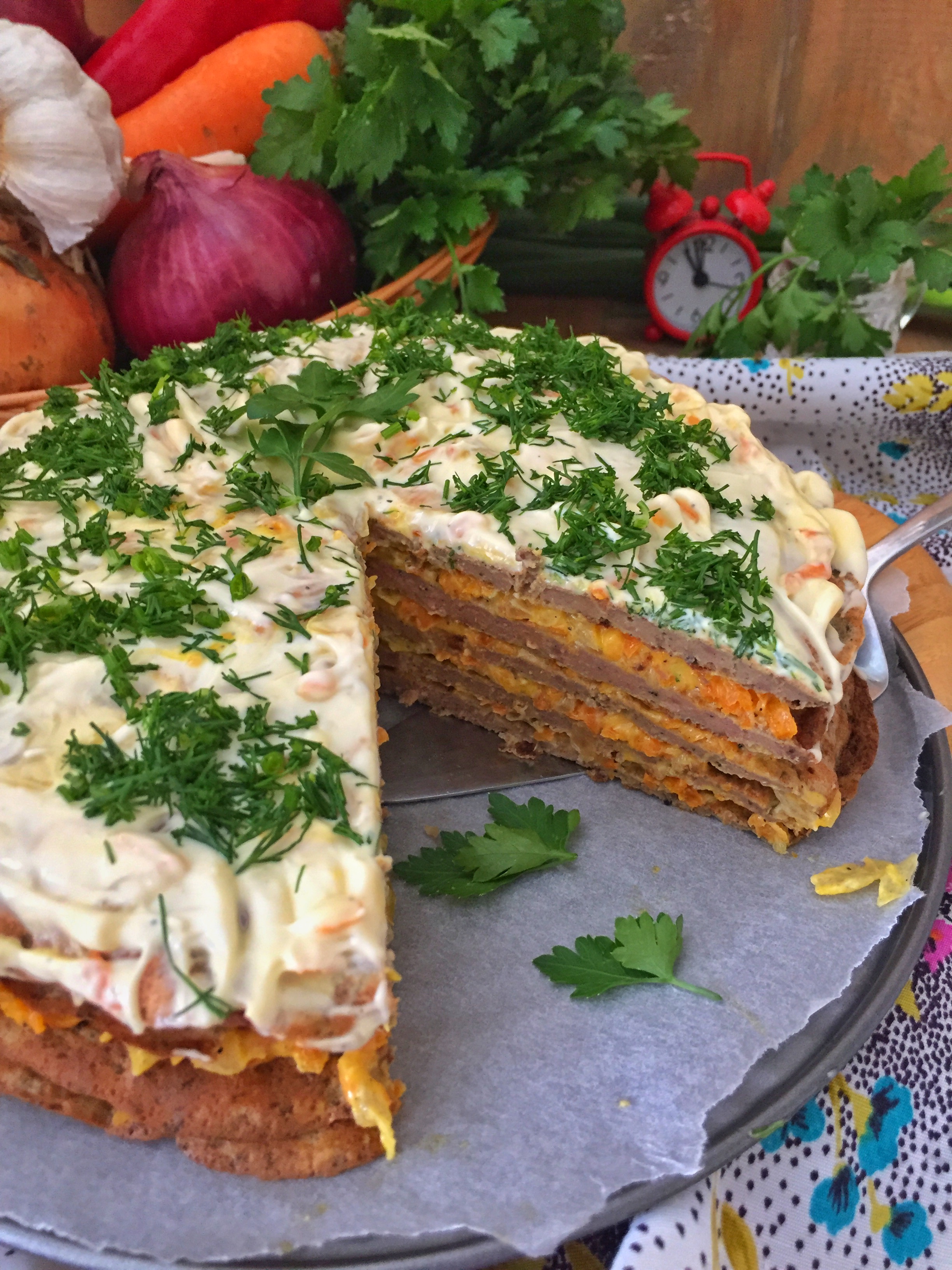 Печёночный торт — это сытная и эффектная закуска, которая прекрасно подойдёт как для праздничного стола, так и для повседневного ужина. Основа торта — нежные, тонкие коржи из печёночного теста, которые напоминают блинчики, но обладают насыщенным вкусом. Пропитка из обжаренной моркови, лука, чеснока и майонеза делает торт сочным, ароматным и невероятно вкусным. Добавление зелени придаёт свежесть и лёгкую пикантность. Такой торт удобно готовить заранее — он становится только вкуснее, пропитываясь в холодильнике. Его можно подавать порционно или нарезать как классический торт, радуя гостей необычной подачей. Печёночный торт — это отличный способ подать печень в непривычном, но очень аппетитном виде.