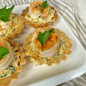 6. Выложите по одной креветке сверху на каждую тарталетку.