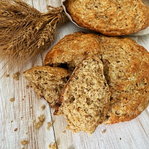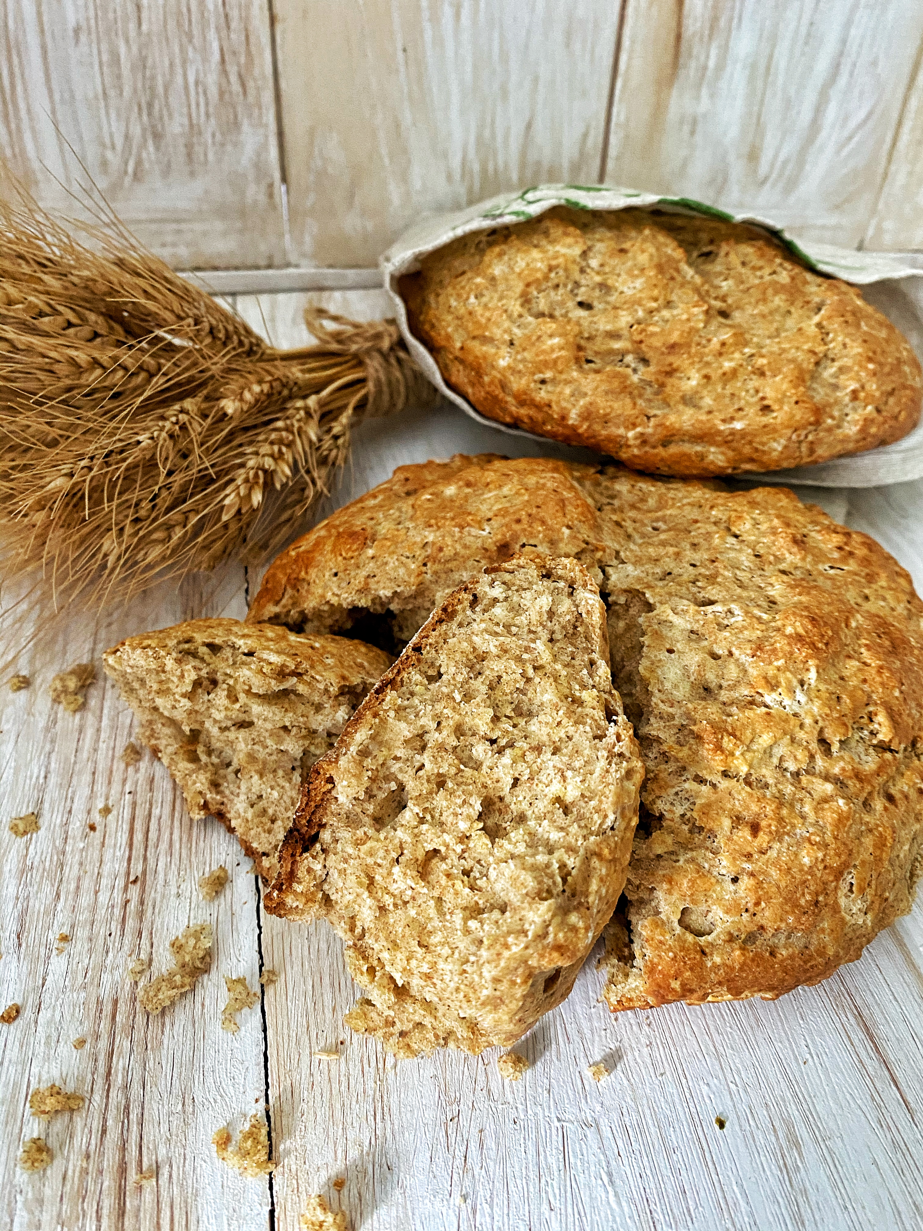 Ирландский бездрожжевой хлеб — это простой и быстрый способ приготовить ароматную домашнюю выпечку без необходимости замешивать тесто с дрожжами. Благодаря сочетанию кефира, соды и разрыхлителя хлеб отлично поднимается и получается пышным, с плотным, но мягким мякишем. Добавление цельнозерновой муки и коричневого сахара придаёт ему приятный, слегка ореховый вкус и лёгкую сладость. Сливочное масло делает структуру нежной и рассыпчатой, а тыквенные семечки добавляют хруст и оригинальность. Этот хлеб идеально подойдёт к супам, салатам или просто с маслом и мёдом на завтрак. Он не требует подъёма и выпекается за считанные минуты — отличный вариант, когда хочется домашнего хлеба быстро.