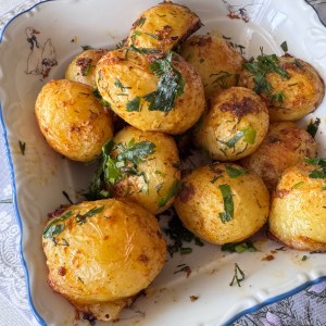 Запечённый молодой картофель со специями — это простое, но невероятно ароматное блюдо, которое подойдёт как для будничного ужина, так и для праздничного стола. Молодой картофель с тонкой кожурой предварительно отваривается, а затем запекается в духовке с оливковым маслом, свежим чесноком и пряной смесью специй. Благодаря паприке и куркуме картофель приобретает аппетитный золотистый цвет и лёгкий дымный аромат. Хрустящая корочка снаружи и мягкая серединка внутри делают его особенно вкусным. Перед подачей блюдо посыпают свежей зеленью, что добавляет свежести и яркости. Такой картофель можно подать как самостоятельное блюдо или как гарнир к мясу, рыбе или овощам.