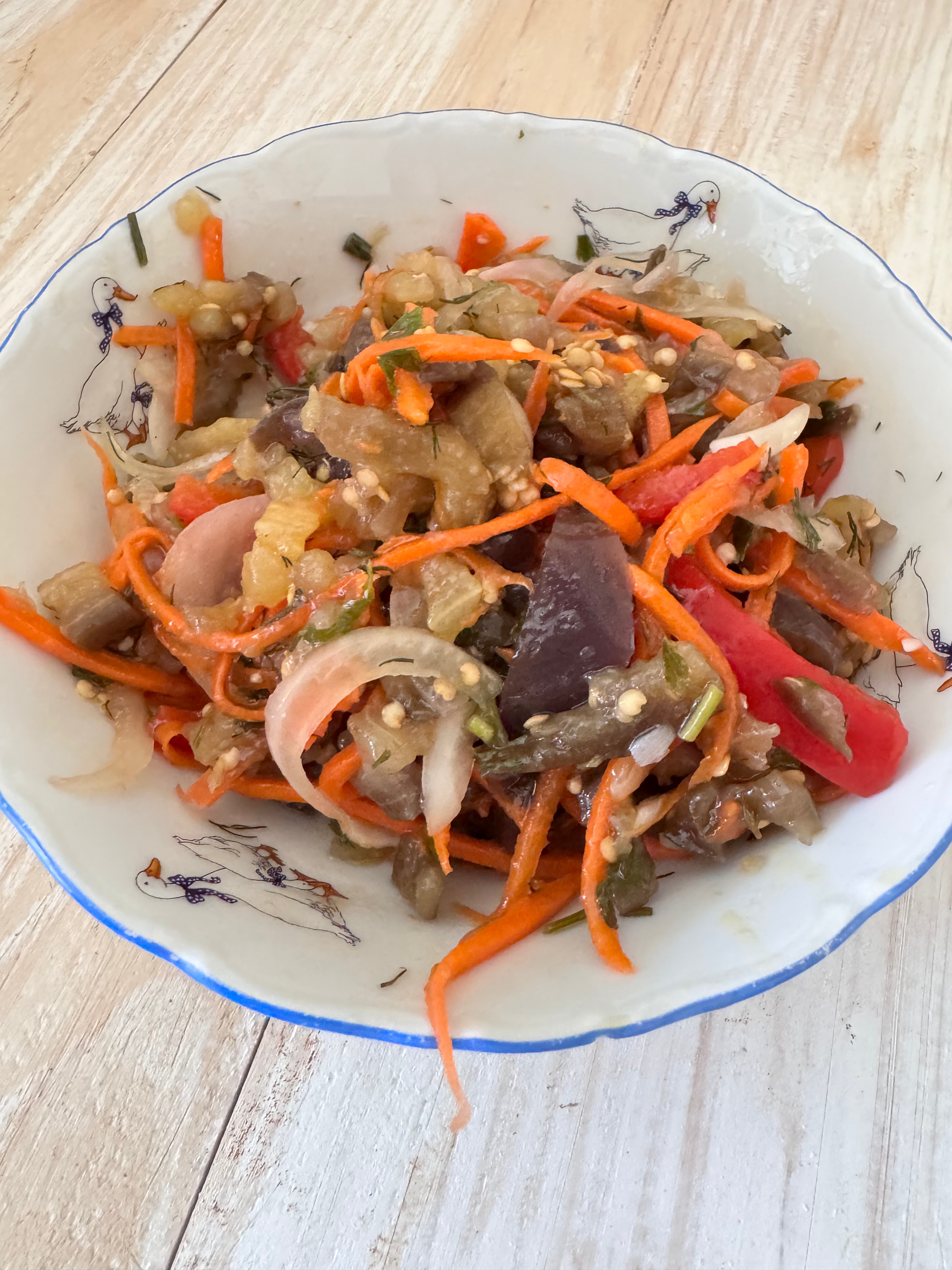 Представьте себе аромат свежей зелени, нежных, чуть хрустящих баклажанов и сочных овощей, пропитанных лёгким пикантным маринадом. Этот салат готовится всего за сутки, а результат — будто из домашнего ресторана: сбалансированная кислинка, тонкая сладость, свежесть укропа и петрушки. Лёгкая тепловая обработка позволяет баклажанам сохранить нежность, а моркови и перцу — их яркую текстуру и вкус.