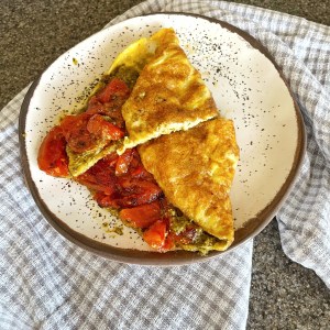Давно у нас не было в блоге завтраков. Да что там завтраков, если посмотреть последние несколько записей, можно решить, что кроме выпечки мы ничего не едим. Поэтому срочно исправляюсь и делюсь простым, но оригинальным рецептом омлета. Его изюминка в соусе песто. При нагревании базилик раскрывается и источает особый вкус и аромат. А, в сочетании с теплыми, мягкими, слегка сладкими от прожарки помидорами это блюдо вообще становится вкусовой бомбой.